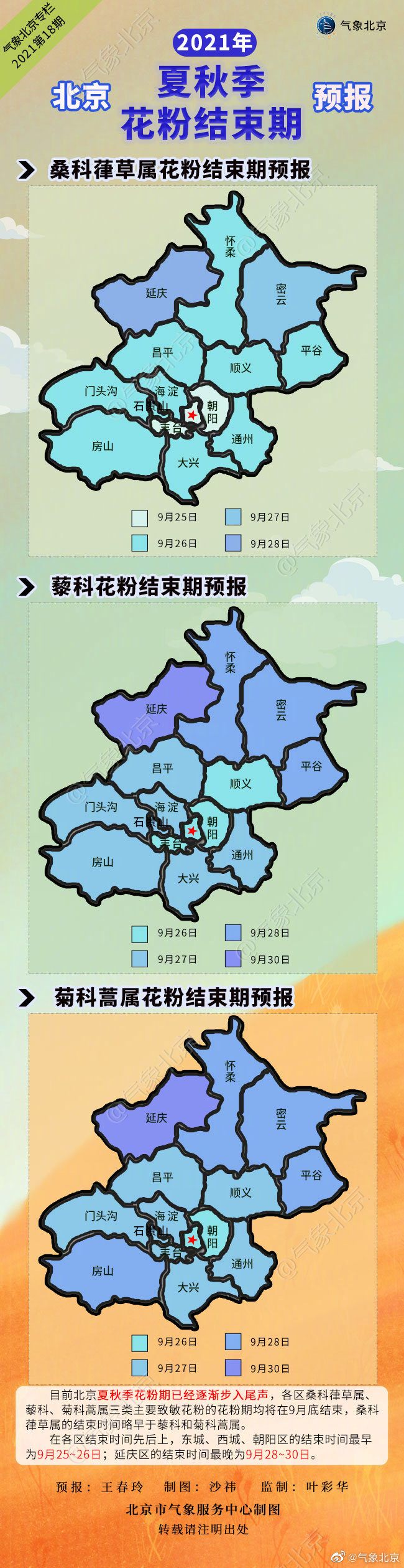 据@气象北京微博消息,目前北京夏秋季花粉期已经逐渐步入尾声,各区桑科葎草属、藜科、菊科蒿属三类主要致敏花粉的花粉期均将在9月底结束,桑科葎草属的结束时间略早于藜科和菊科蒿属。在各区结束时间先后上,东城、西城、朝阳区的结束时间最早为9月25~26日;延庆区的结束时间最晚为9月28~30日。